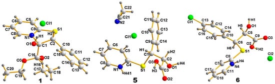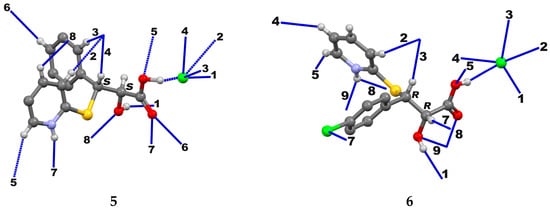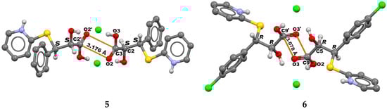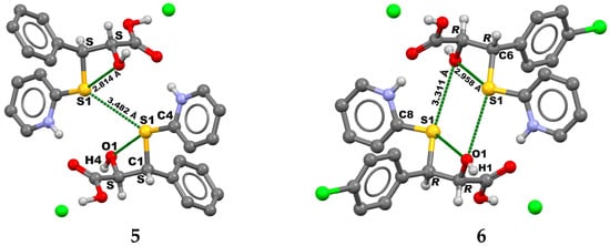 Due to the thermodynamic stability of 1–4, the expected acyclic products, 2-((1-(substituted)-3,3-diethoxy-2-oxopropyl)thio)pyridin-1-ium chlorides (I), were not observed (Scheme 1). The structures of 1–4 were fully characterized by 1H and 13C NMR, ESI-MS, as well as elemental and X-ray analysis (for 1). In the 1H NMR spectra of 1–4, the CHS and OH protons are observed at δ 4.37–4.54 and 9.64–9.98, respectively. Elemental analyses (see ESI section) and ESI-MS peaks at 332.21 [Mr-Cl−]+ (1), 366.08 [Mr-Cl−]+ (2), 350.10 [Mr-Cl−]+ (3), and 270.25 [Mr-Cl−]+ (4) support the formulations, which are also proved by X-ray crystallography for 1 (Figure 1). The structures of 5 and 6 were also established by X-ray diffraction. In the 1H NMR spectra of 5–8, the two protons at asymmetric centers (SCH and CНOH) display two doublets at δ 4.46 and 5.51 (for 5), 4.45 and 5.52 (for 6), 4.42 and 5.55 (for 7) and 4.26 and 4.35 (for 8) with the vicinal coupling constant J = 3.0 Hz. The mass spectra of these compounds display molecular ion peaks at 276.09 [C14H14NO3S]+ (5), 310.78 [Mr-Cl−]+ (6), 294.32 [Mr-Cl−]+ (7), and 214.26 [Mr-Cl−]+ (8) (see experimental section). These compounds may stabilize as syn- or anti-isomers, depending on the nature of the involved intermolecular noncovalent interactions (Figure 2, Figure 3, Figure 4 and Figure 5). For example, 5 is stabilized as a syn-isomer whereas 6 is stabilized as an anti-isomer in the solid state. In the latter compound also presents an additional halogen bonding with a short O···Cl distance (3.067 Å) that is shorter than twice the sum of the van der Waals radii of the interacting atoms (O + Cl = 1.52 + 1.75 = 3.27 Å) [] (Figure 5), and with the O···ClCAr angle of 162.86°. A Cl− in both compounds provides negative charge-assisted hydrogen bonds with hydroxylic and carboxylic–OH, asymmetric SCH, and aromatic CH protons (Figure 4). Moreover, 5 and 6 contain an intramolecular 1,4 S···O synthon with the distance of 2.814 and 2.958 Å, respectively, suggesting that there is a strong chalcogen bonding between the electron-donating hydroxyl O atom and the acceptor S atom of the thioether, as compared with the sum of the van der Waals radii of 3.32 Å []. Moreover, these distances are shorter than the corresponding distance of 3.147 Å to be found in the 1,4 S···O synthon of acetazolamide []. The intermolecular S···S chalcogen and C···O tetrel bond distances of 3.482 and 3.176 for 5, 3.413 and 3.078 Å for 6 (van der Waals radii 1.80(S) + 1.80(S) = 3.60 Å and 1.70(C) + 1.52(O) = 3.22 Å) [], respectively, also prove strong noncovalent interactions in both compounds (Figure 2 and Figure 3). The O(2)···O(2′) and O(3)···O(3′) distances of 3.405 and 3.324 Å for 5 and 6, respectively, are longer than twice the sum of the van der Waals radii of the interacting atoms (1.52(O) + 1.52(O) = 3.04 Å) [] (Figure 3). In 6, an additional intermolecular S···O chalcogen bond distance also falls in the van der Waals region with a high directionality of 168.07° (Figure 2).