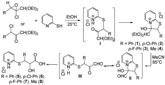 Reaction of 2-chloro-2-(diethoxy- methyl)-3-substituted-oxirane or 1-chloro-1-(substituted)-3,3-diethoxypropan-2-one, which proved to be convenient reagents in the synthesis of interesting heterocyclic systems [,,,], with pyridine-2-thiol in EtOH at 25°C yields 3-(diethoxymethyl)-3-hydroxy-2-substituted-2,3-dihydro-thiazolo[3,2-a]pyridin-4-ium chlorides (1–4), which subsequently, in MeCN at 85°C, transforms into ring-opening products, 2-((2-carboxy-1-(substituted)-2-hydroxyethyl)thio)pyridin-1-ium chlorides (5–8), having tetrel, chalcogen, and charge-assisted hydrogen bonds (Figure 1, Figure 2, Figure 3 and Figure 4). Additionally, the use of the dihalogen functionalized substrate 2-chloro-3-(4-chlorophenyl)-2-(diethoxymethyl) oxirane or 1-chloro-1-(4-chloro-phenyl)-3,3-diethoxypropan-2-one leads to halogen bonding in the reaction product 6 (Figure 5).