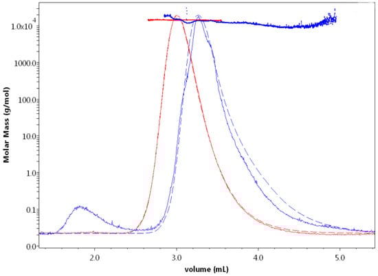 Light scattering curves with the corresponding calculated molar masses obtained for HEWL eluted in 0.1 M NaOAc buffer containing 0 M (red) and 2 M (blue) NaCl. At 2 M NaCl, HEWL displayed a significant delay in its elution from the column and aggregates were first eluted and were shown by the light scattering signal (solid line) as a small peak (eluted around 1.8 mL) preceding the main peak (eluted around 3.4 mL). The absorbance curves (dashed) demonstrate the same elution volume behavior and are very much aligned with the LS curve of HEWL eluted with 0 M NaCl. This is not the case for HEWL eluted with 2 M NaCl, which does not show any information about higher molecular weight protein aggregation.