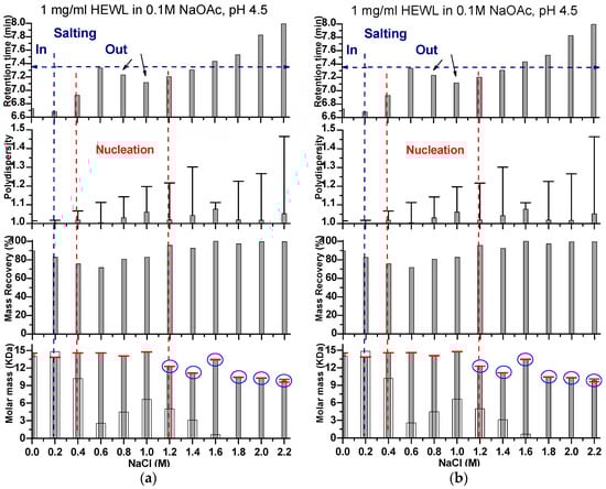 Graphical representation for the change in retention time obtained from SEC. Also given are the polydispersity, mass recovery, and molar mass obtained from in line SLS data analysis (horizontal red line on which are the error bars). In the molar mass panel, the molar masses calculated from the standard calibration curve of the gel filtration column are shown in white columns. Figure 3a,b indicate the data for HEWL eluted using a mobile phase containing a wide range of NaCl concentrations at a protein concentration of 1 and 2 mg/mL, respectively. The retention time increases with increasing NaCl concentration in the mobile phase. At two supersaturation levels, the retention time showed a slight drop before it continued again its increase. One drop was detected at the interface between the salting in (when the protein became more soluble by the first addition of sodium chloride) and salting out (when the protein became less soluble at increasing NaCl concentrations). On the graphs, the dashed blue line shows the limit between the salting in and the salting out as per our observations. The second drop (indicated by the black arrow) occurred at the supersaturation level that is most probably coinciding with nucleation (the area between the two dashed red lines), as was shown by the drop of mass recovery and subtle increase in the molar mass. At higher supersaturation levels, additional bands for aggregates preceding the bands under study appeared on LS graphs (shown on the graph as blue circles), which coincided with a drop in molar masses of the main protein peaks and increase in their polydispersity.