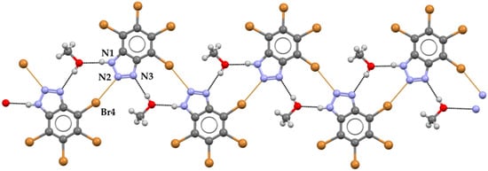 The crystal structure of 1 shows that the two components of this solvate play a multifaceted role in the crystal packing. Both methanol and TBBT have the dual role of HB donors and acceptors, and TBBT also works as self-complementary XB donor and acceptor (Figure 1). Specifically, short C−Br4∙∙∙N2 contacts (291.4(4) pm) form halogen-bonded infinite chains, which develop along the b crystallographic axis. These XBs are probably rather strong, since the observed Br∙∙∙N separation corresponds to a normalized contact (Nc) of 0.86 [], a quite low value for this type of XBs []. Consistent with the involvement of the lone pair of N2 in the Br∙∙∙N XB formation, the bromine atom is nearly coplanar with the triazole ring (the distance of bromine from the mean square plane through the triazole heavy atoms is 15.1 pm) and N1–N2∙∙∙Br4 and N3–N2∙∙∙Br4 angles are 115.54° and 135.38°, respectively. Any two adjacent TBBT molecules are further connected by a methanol molecule, which bridges N1 of one molecule and N3 of the other. The former interaction, where TBBT is the HB donor, is much shorter than the latter, where TBBT is the HB acceptor (N∙∙∙O separations are 277.3(5) and 294.5(5) pm, respectively). This difference is probably related to the fact that TBBT is a weak acid (pKa ≈ 5) and a very weak base []. These HBs are nearly coplanar with the benzotriazole moiety and, along with the XBs, give rise to nearly planar ribbons that loosely interact with each other [].