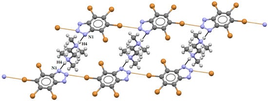 Three bis-protonated TMEDA molecules and hydrogen-bonded TBBT units (Mercury 3.9, ball and stick representation). HBs are represented by black lines; Br∙∙∙N halogen bonds are represented by brown dotted lines. The color code of atoms is the same as that in Figure 1.