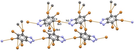 Partial view (Mercury 3.9) of two infinite chains formed by Br∙∙∙N halogen bonds and bridged by Br∙∙∙π halogen bonds. Both halogen bond types are brown dotted lines. The color code of atoms is the same as that in Figure 1.