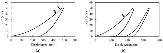 Figure 2 illustrates typical load-displacement curves obtained under single and double cyclic nanoindentation tests, with shift of the second cycle curves in double cyclic nanoindentation for clarity. For both testing modes, pop-in events marked by arrows in Figure 2 are observed during the loading process under various loading/unloading rates. This event was reported as a result of slip generation in dc-Ge sample and/or phase transformation to (β-Sn)-Ge [10,14]. In addition to the pop-in event during loading, unloading also showed some specific deformation events, i.e., pop-out and elbow as illustrated in Figure 3. The correlation between these events and phase transformation has been established for indentation of Si [23,24,25,26,27,28] and cold indentation of Ge [10]. At room temperature, ultra-fast indentation of dc-Ge also triggered these phenomena [8], but the correspondence of these events with phase transformation was not clearly addressed. Thus, the correlation between these events and phase transformation behavior will be further discussed later in this section.