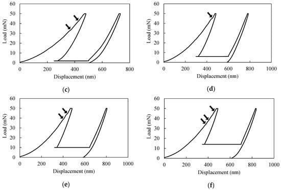 Load-displacement curves obtained by each mode of indentation under loading/unloading rate of 50 mN/s and LHT = 5 s: (a) single; (b) double, ∆P = 0 mN (no residual load); (c) double, ∆P = 2 mN; (d) double, ∆P = 6 mN; (e) double, ∆P = 10 mN; (f) double, ∆P =14 mN: all graphs of double cyclic indentation include artificial shift between cycles (arrows indicate pop-in events).