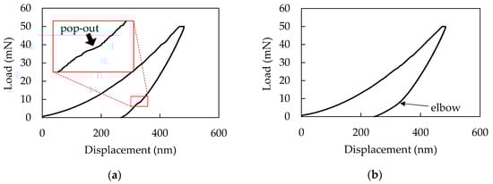 Specific deformation in unloading process: (a) pop-out; (b) elbow (single, loading/unloading rate of 50 mN/s).