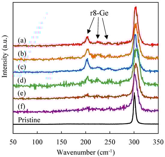 The mechanism for promoting the formation of r8-Ge by multi cyclic nanoindentation can be explained by referring to a previous study on Si [20]. In that study, during multi cyclic nanoindentation, it was suggested that the transformed r8-Si/bc8-Si region expanded during subsequent cycles and finally a larger r8-Si/bc8-Si region was formed compared to single indentation [20]. This mechanism can be employed to this study. Namely, compared to single indentation, double cyclic indentation with small ∆P can expand the transformed region and result in a higher detection fraction of r8-Ge. The lower detection of r8-Ge under ∆P = 0 mN compared with ∆P = 2 mN is possibly caused by an error of noncontact between the indenter tip and sample surface. The case for ∆P = 0 mN means that the load was completely removed from the sample, and the indenter tip might leave the sample surface. In such a case, friction might occur at the second contact and cause shear in the Ge sample, which could lead to phase transformation to dc-Ge or st12-Ge [7,14,17]. It should be noted that 1 of 20 indents with a residual load of 0 mN and loading/unloading rate of 50 mN/s has peaks around 195, 250, and 280 cm−1 corresponding to st12-Ge. The phase transformation caused by shear does not contain r8-Ge [7,14,17], so friction during LHT might prevent the formation of r8-Ge under ∆P = 0 mN compared with ∆P = 2 mN even though the phase transformation to r8-Ge was still dominant compared to other higher ∆P. However, there may well be other explanations for the lower r8-Ge probability for the 0 mN LHT case, and further experiments would be needed to resolve this issue.