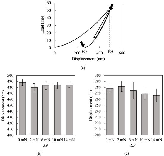 (a) An example of indentation load-displacement curve obtained under double cyclic indentation (real data without artificial shift); (b) the indentation displacement of the beginning of the second cycle unloading; (c) the indentation displacement after the second cycle.