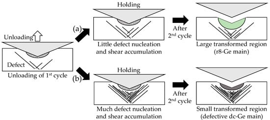 According to the analysis mentioned above, possible phase transformation pathways during double cyclic nanoindentation corresponding to low and high residual loads are illustrated in Figure 8a,b, respectively. During loading of the first cycle, typical phase transformation to (β-Sn)-Ge [1,2,3,4] and defect nucleation in the non-transformed region [8,10,14] occurs. After unloading of the first cycle, the transformed region is a mixture of (β-Sn)-Ge and other transformed phases [5,6,7,8,9,10,11]. For the case of low residual load in Figure 8a, there is little defect nucleation in the surrounding region and little shear accumulation in transformed region during LHT. This enables phase transformation to r8-Ge during the second cycle and a larger transformed region than a single indentation. As a result, r8-Ge is more frequently detected as the end phase. On the other hand, high residual load causes much defect nucleation and shear accumulation as shown in Figure 8b, which limits the extension of the transformed region during the second cycle. In addition, the accumulated shear results in more defective dc-Ge than r8-Ge. These processes lead to less formation of r8-Ge.