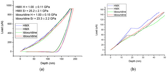 (a) Typical load-depth curves for HMX and idoxuridine, with indentations in two random crystals of each material shown. Modulus values reported in the figure are the average values of ≈20 indents in each material. (b) The same load-depth curves as in (a), showing only data below 150 μN. Note there is evidence of yield point behavior at loads less than 100 μN, and multiple yield events on loading, which are common in materials with limited slip systems.