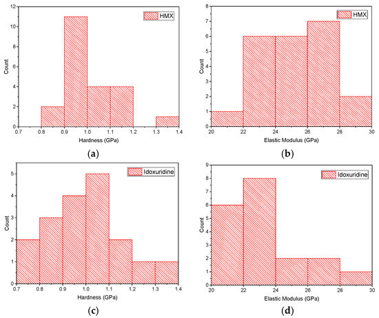 (a) HMX hardness measurement distribution. (b) HMX reduced elastic modulus measurement distribution. (c) Idoxuridine hardness measurement distribution. (d) Idoxuridine reduced elastic modulus measurement distribution.