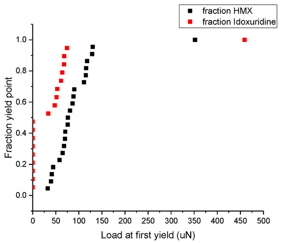 Cumulative fraction of yield behavior for HMX and idoxuridine. While the mean load at yield for indentations that did exhibit a distinct yield point was statistically similar (93 and 98 μN for HMX and idoxuridine, respectively), the materials exhibit different behavior in yield distribution. While all indentations in HMX showed a yield point, only half the indentations in idoxuridine showed.