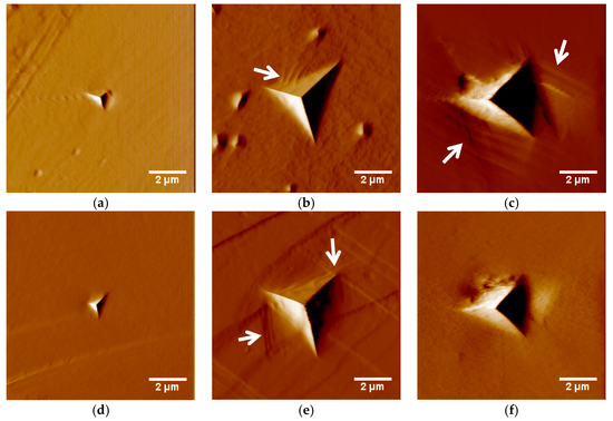 Scanning probe images (in deflection mode using the Hysitron Triboindenter imaging mode, which are therefore indicative of slope, not height, to accentuate small surface topography changes) of (a) 500 μN Berkovich indent on idoxuridine, (b) 5000 μN Berkovich indent on idoxuridine, (c) 5000 μN cube corner indent on idoxuridine, (d) 500 μN Berkovich indent on HMX, (e) 5000 μN Berkovich indent on HMX, and (f) 5000 μN cube corner indent on HMX. Slip steps are evident in (b,c,e) (noted with arrows), but it is not possible to conclusively state if cracks are present in some of the images, such as the dark band in the lower left of (c).