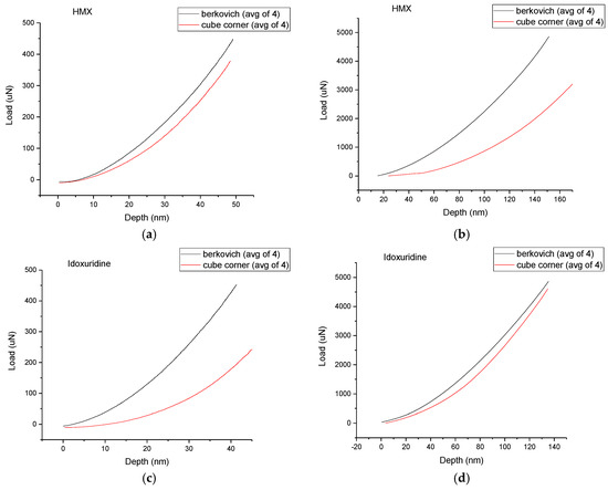 (a) HMX unloading comparison at 500 μN. (b) HMX unloading comparison at 5000 μN. (c) Idoxuridine unloading comparison at 500 μN. (d) Idoxuridine unloading comparison at 5000 μN.