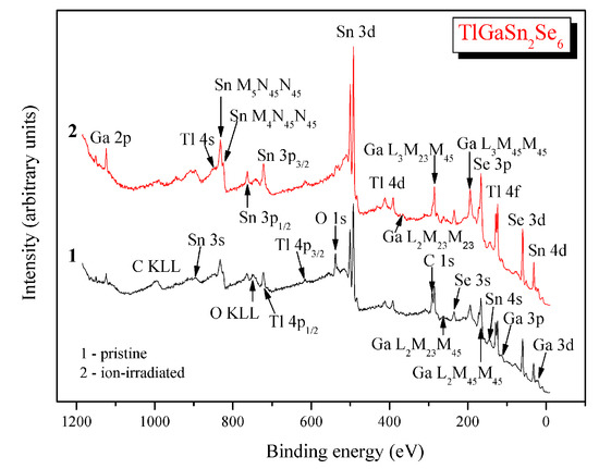 Survey X-ray photoelectron spectroscopy (XPS) spectra recorded for (1) pristine and (2) Ar+ ion-irradiated surfaces of the TlGaSn2Se6 alloy.