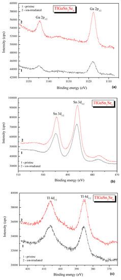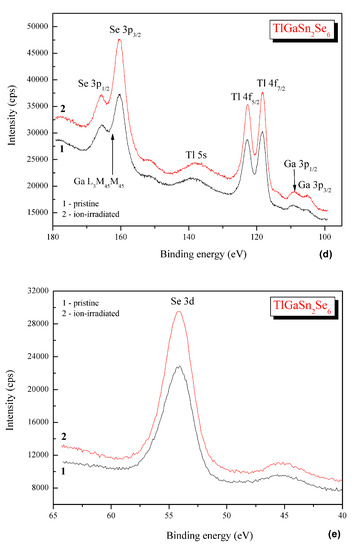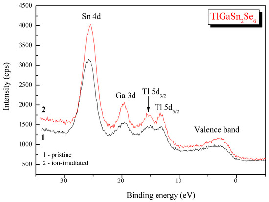 Tl1–xIn1–xSnxSe2 (x = 0.1, 0.2, and 0.3), namely Ag2In2SiSe6 and Ag2In2GeSe6 [20]. In our opinion, the above-mentioned effect of decreasing the binding energies of the Sn 3d and Sn 4d core-level electrons can be attributed to the removing of a very thin tin oxide species that are formed on the pristine TlGaSn2Se6 alloy surface due to its exposure to air. Taking into consideration the relative intensities of the XPS Tl 4f7/2, Ga 3p3/2, Sn 3d5/2, and Se 3d core-level lines and the related atomic sensitivity factors (ASF) reported in Ref. [45], we can conclude that in the case of ignoring the presence of carbon and oxygen adsorbed species the Ar+ ion-bombardment does not cause visible changes of the stoichiometry of the TlGaSn2Se6 topmost surface layers. Literature data indicate that the binding energy values for the Sn 3d5/2 core-level electrons in highest tin oxide, SnO2, correspond to 286.8–287.0 eV [46,47], which are rather close to those in the TlGaSn2Se6 alloy under study (see Table 4). As can be seen from the survey spectra presented in Figure 4, the Ar+ ion-irradiation induces almost complete elimination of the O 1s core-level line from the TlGaSn2Se6 alloy surface. The effect of such elimination of a very thin SnO2 species is detected in the present XPS experiments, as the above-mentioned decreasing the binding energies of the XPS Sn 3d and Sn 4d core-level electrons in the case of the Ar+ ion-bombardment of the TlGaSn2Se6 alloy surface. Our XPS measurements unambiguously show that the Ar+ ion-irradiation does not bring visible changes of the shapes of the XPS core-level spectra (Figure 4), as well as energy distribution of the electronic states within the valence-band region of the TlGaSn2Se6 alloy (Figure 5). This fact allows us to conclude that the TlGaSn2Se6 crystalline alloy surface is rather rigid with respect to the influence on it the X-ray irradiation.