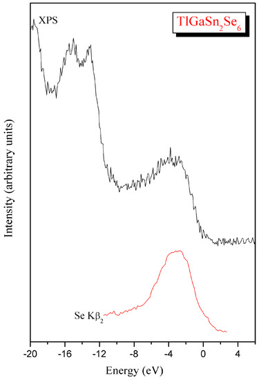 For the TlGaSn2Se6 alloy, we have also measured the XE Se Kβ2 band, bringing information regarding the energy distribution of the Se 4p states and matching it on a common energy scale with the XPS valence band spectrum. The results of such matching the above X-ray photoelectron and emission spectra measured for the TlGaSn2Se6 alloy following technique [48] are depicted in Figure 6. Following this figure, the spectral maximum of the XES Se Kβ2 band is positioned mainly at the upper portion of the XPS valence-band spectrum. Therefore, the principal contributions of the Se 4p states are detected at the upper part of the valence band for the TlGaSn2Se6 crystal, with the lesser contributions in other parts of the band. Similar peculiarity of the valence band by the Se 4p states is typical for the related quaternary selenide, TlInGe2Se6, as it established in Ref. [31]. It is worth mentioning that one can also expect substantial contributions of the Tl s, Sn d, and Ga p electronic states to the valence band of the TlGaSn2Se6 compound, however, the present available facilities do not allow for recording the energy distribution of these states by our group.