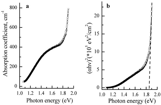 where A is a constant that is determined by the inter-band transition probabilities, n is a power index characterizing the optical absorption process that (for perfect crystals) is equal to 2 and 1/2 for indirect and direct allowed transitions, respectively. However, this rule is substantially disturbed for the chalcogenide crystals due to presence of a large number of intrinsic cationic defects and exact application of this equation is limited. However, following the presented in Figure 7 dependence, one can see that it is closer to the direct transition [51] (see Figure 7b) with Edg = 1.86 eV.