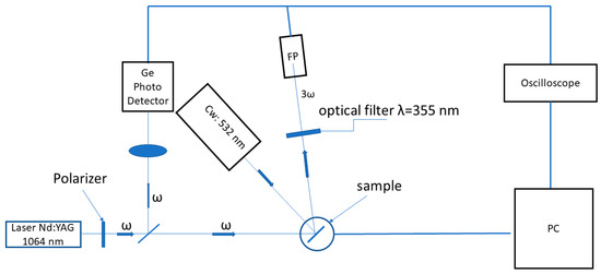 Principal set-up for measurements of the reflected photoinduced third harmonic generation (THG).