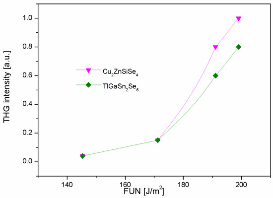 Beginning from 170 J/m2 (Figure 9), a sharp increase of the THG intensity appears. As a reference compound, we have chosen a Cu2ZnSiSe4 crystal that was calibrated earlier [55,56,57]. Figure 9 indicates that such technique allows evaluating the efficiency of the THG intensity determined from angle dependent maxima with respect to the reference sample.