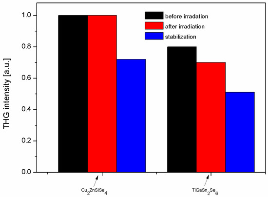 Additional source of the effect is caused by space redistribution of the free carriers, which give additional contribution to the changes in the THG. In Figure 10 are presented principal results devoted to the laser induced changes of the THG. The red colour corresponds to the values of the THG immediately after irradiation (up to 1 s). The blue colour corresponds to the effect after stabilisation, which rated up to 200–400 s. The stabilisation of the laser operated changes is caused by the redistribution of the photoinduced layers due to the photopolarization, photothermal effects, and free carriers. The Cu2ZnSiSe4 crystals are used only as a reference. It is clear that, at the beginning, the changes for the reference crystals are absent and only after few minutes corresponding changes were observed. It is crucial that such behaviour is contrasted with the reference Cu2ZnSiSe4 crystals. This fact may confirm the principal difference of the laser induced THG for different chalcogenides.