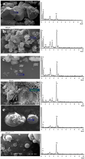 Scanning electron microscopy with energy dispersive X-ray (SEM-EDX) analysis of calcium carbonate crystals produced by various bacterial ureolytic species in aqueous solution supplemented with Ca2+. Crystals produced by B. subtilis LN8B (a), Halomonas sp. LM12ABN (b), Rhodococcus erythropolis TN24F (c), Bacillus subtilis TN21G (d), Salinivibrio sp. LM9A (e) and Bacillus subtilis LN13DC (f). Methodology can be reviewed in [43].