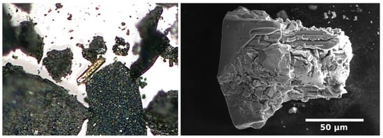 Left: Photograph of a CuHg single crystal under an optical microscope (size of the crystal: 87 × 13 m) showing well-shaped faces, the typical prismatic habitus and bronze luster. Right: Scanning electron micrograph of a CuHg crystal after EDX measurements. Deterioration effects due to high vacuum and electron beam are clearly visible.