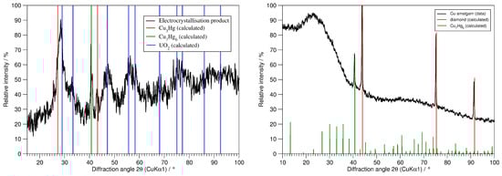 Left: Powder diffraction pattern of the electro-crystallization product. The broad maxima originate from nano-scaled UO; the sharp maxima belong to both Cu amalgams CuHg and CuHg. Right: Powder diffraction pattern of a sample of Cu amalgams. Data collection was performed in parafocusing Debye–Scherrer transmission geometry on a capillary sample diluted with diamond powder.