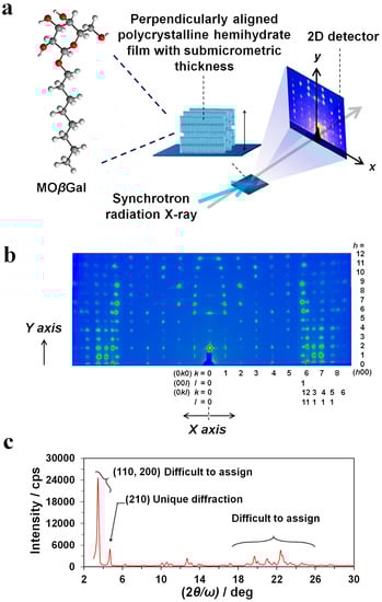 The method based on grazing incidence X-ray diffraction (GIXD) with a two-dimensional detector has received increased attention for identifying crystal structures of organic semiconductor thin films [], but less attention has been paid to applying this method to the crystal structure analysis of synthetic glycolipids. On the other hand, we have recently applied the analytical methodology to the crystalline structure analysis of hemihydrate crystals of one synthetic glycolipid, octyl β-d-galactoside (MOβGal) (Figure 1) []. We prepared relatively thick films to avoid the confinement effect by thinning the crystal structure since the structural analysis targeted the bulk crystal of synthetic glycolipid. Because of the highly aligned behavior in the LC state of synthetic glycolipid, even at sub-micrometer thicknesses, crystallization from the aligned LC state successfully afforded the perpendicularly aligned sub-micrometric polycrystalline film. The polycrystalline film, in which each crystal was randomly aligned in parallel, but was perpendicularly aligned to the substrate, made the reciprocal images, which afforded numerous diffraction spots even without rotating the sample. The use of aligned samples was preferred for a better description of the LC phase of synthetic glycolipid [,], but few studies seem to apply this structural analysis method to crystal species []. As a result, important crystal parameters, such as lattice constants, space group, and symmetry, were analyzed for the MOβGal hemihydrate crystal (Figure 1b), which were difficult to obtain using PXRD analysis of a non-oriented powder sample (Figure 1c). Importantly, the crystal structure consisted of a “ribbon phase”, with a large number of formula units per unit cell (Z). The space group was assumed as P212121, with lattices constants, a = 47.9Å, b = 27.4 Å, and c = 4.73 Å, which did not obey the general tendency of a ≈ bilayer length >> b > c ≈ interval of alkyl chain packing that is observed for typical synthetic glycolipid crystals that are solved by single-crystal structure analysis [,,,,,,,,]. Moreover, not only is the methodology useful for depicting such static crystalline structure analysis, but it is also useful for pursuing the dynamic nature of solid–solid transitions, such as dehydration and continuous structural changes in the anhydrous crystal forms as the temperature varies []. Solid–solid phase transitions occurred after the perpendicular alignment of polycrystalline MOβGal crystals persisted, affording detailed structural analysis using the same sample under non-ambient atmosphere conditions. Thus, this analytical method was assumed to greatly contribute to the development of crystalline glycolipid research, which seemed to still include many unsolved issues, as mentioned above.