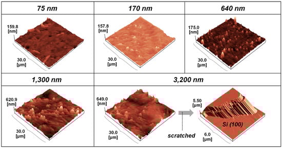 Atomic force microscopy (AFM) images of MOβGal hemihydrate polycrystalline films with various thicknesses. For the 3200-nm-thick film, the scratched image is also depicted on the right.