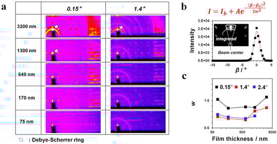 In Figure 3a, the reflection spots for thin films, such as the 75 nm-thick film, were drastically obscured under these conditions due to the low intensity of diffraction spots, whereas those for thicker films were clearer. However, it was apparent that half of the concentric diffraction rings, as indicated by the white arrows, became clearer for the thicker films, regardless of the incident angles. Such rings, so-called Debye–Scherrer rings, as produced by Bragg reflections, are obtained when an X-ray falls on a mass of tiny crystals in all of the orientations. It means that the crystals in thicker films have a low degree of alignment. In order to obtain quantitative data for comparison, the β-scan profiles for the perpendicularly aligned reciprocal spot at the (200) index were depicted and analyzed by fitting with Gaussian distribution functions. Figure 3b shows a representative result and the integration area. In Figure 3c, the results of ω, which correspond to full width at half maximum (FWHM) for the profiles, were compared as a function of film thickness with the three incident angles: 0.15°, 1.4°, and 2.4°. It was noteworthy that as the film thickness increased from 75 nm, each ω with the various incident angles decreased. Reversely, the increase in film thickness above 640 nm increased it. When considering the factors of the alignment degree and peak intensity, relatively thick films were thought to be adequate for obtaining a GIXD image with a higher resolution. This is because thinner films exacerbate both factors and thicker films exacerbate the high degree of alignment. The confinement effect can somewhat decrease the degree of crystalline alignment for thinner films [,], and the rapid crystallization might reduce the alignment degree for the thicker films. Thus, we determined that the use of relatively thick MOβGal films (thickness = 640 nm) was best for further analysis. However, unexpectedly, despite the removal of the Debye–Scherer ring influence on the GIXD profile with the 640-nm-thick film and that relatively sufficient intensity was obtained, the diffraction spots in the reciprocal image were unclear, in particular, in the 0.15° incident angle GIXD profile (Figure 3a). However, the diffraction spots at higher diffraction angle regions seemed to be clearer for the GIXD profiles that were obtained with an incident angle of 1.4°.
