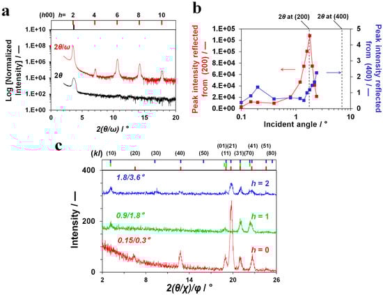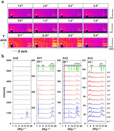 At first, the diffraction spots disappeared at low h index reflections as the incident angle increased. For instance, a series of reflections at (0kl) completely disappeared for the GIXD images with incident angles greater than 0.8°. Moreover, even a series of reflection spots at (1kl) completely vanished for the GIXD images with incident angles greater than 2.2°. These results arise from the difficulty of capturing reflections from angles that are lower than the corresponding incident angle. This is one of the reasons why an incident angle near the total reflection angle is preferred for GIXD analysis. On the other hand, as the second characteristic of such high-incident angle X-ray sources, some of the diffracted peaks (red lines in Figure 4b) in the reciprocal angles become more clear than those that are obtained with low-incident angle X-rays (blue lines in Figure 4b). That is, multiple and/or connected broad diffraction peaks appeared in the GIXD profiles with the low-incident angles due to the two-beam effect, which makes the peaks difficult to assign individually. On the other hand, under the high-incident angle conditions, the number of reflection points at which the Ewald sphere condition is fulfilled, and peak splitting decreases and only fine spots remained, which become individually separated enough to be assigned. From these results, it was found that the use of a high-incident angle was effective for identifying the reflection spots at higher angles along the perpendicular direction than from the corresponding incident angle.