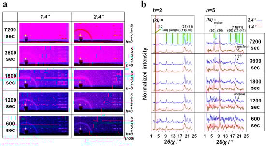 In Figure 5a, the results of GIXD analysis that were obtained for the 640-nm-thick MOβGal films with incident angles of 1.4° and 2.4°, and with different radiation times from 600 to 7200 s, are depicted. The one-dimensional profiles, to confirm the diffraction peaks of (2kl) and (5kl), are shown in Figure 5b. For the diffraction peaks of the (2kl) series, even a short measurement time, such as 600 s, could allow us to assign the indexes of those peaks; however, it was difficult for the (5kl) series peaks. After radiation for 3600 s, the diffraction profile became well resolved, with the incident angle of 2.4°, indicating the importance of the longer radiation times. In addition, the diffraction peaks around 20° did not become well separated for the 1.4° incident angle results, suggesting that the resolution ability with the higher incident angle was better than with the lower incident angle for diffraction peaks at higher h indexes. This is despite the fact that the incident angles were much higher than the total reflection angle. However, at this stage, several ambiguities for peak assignment still remained for the (0kl) and (1kl) series.