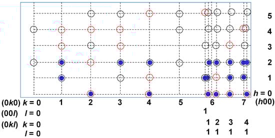 Figure 7 shows a reciprocal image with many reciprocal spots obtained from the two-dimensional GIXD analysis and in-plane measurements, which are also summarized in Table 1. In Figure 7, the reciprocal spots that were further observed by synchrotron radiation were also denoted by red circles. Several additional reflection spots were apparently identified using via the synchrotron radiation source. In addition, the raw reciprocal image from the synchrotron radiation covered the high h index (Figure 1b). For instance, only two reflections corresponding to the (h0l) indexes, i.e., (101) and (301) were detected using a commercial radiation source, whereas the result of the reciprocal image that was obtained via the synchrotron radiation with a large detector further detected (501), (701), (901), and (10 01). However, the data, even without such reciprocal spots obtained with synchrotron radiation, could resolve the characteristic reciprocal spots of (200), (110), and (011), which could not be assigned by conventional PXRD analysis, as shown in Figure 1c. In addition, the lattice parameters a, b, and c were successfully determined; at least, the limiting conditions that (h00) and (0k0) are even were identified (Table 1). Reflections corresponding to (00l) were not observed. In addition, it was difficult to observe the (002) reflection because of the low intensity of the in-plane profile (data not shown). However, at least reflections corresponding to (001) must be detected on account of the extinction law. In addition, although the information of h + l for (h0l) was not sufficient for identification, limitations were not observed in terms of h + k and k + l for (hk0) and (0kl). Summarizing these conditions, an appropriate space group is not available for which an additional extinction law such as h + l = even for (h0l); hence, P212121 in an orthorhombic system is reasonable for selection. Thus, it is reasonable to conclude that the global reciprocal image of the MOβGal hemihydrate is sufficiently constructed by the combination of the results that were obtained from the GIXD analysis with a two-dimensional detector and in-plane measurements using a point detector. In particular, the determination of lattice parameters can demonstrate the uniqueness of the crystal structure of MOβGal hemihydrate.