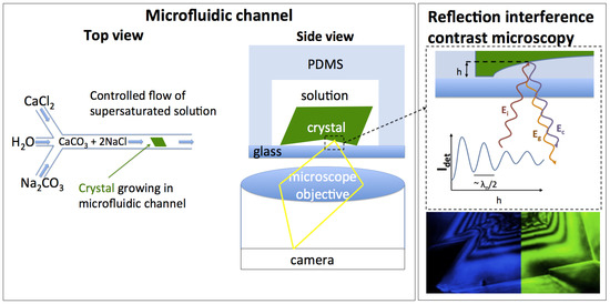 Controlled growth of calcite crystals in a microfluidic device studied by reflection interference contrast microscopy (RICM). (Left) Top view of the microfluidic channel showing how fluids are introduced and mixed to ensure stable supersaturation at the crystal surfaces. The microfluidic device rests on an inverted microscope to allow high resolution imaging of the crystal in situ during growth. The crystal grows on all surfaces, but the surface studied here is confined by the glass surface on which the crystal rests. (Right) Principle of RICM. The crystal is illuminated from the bottom, which is illustrated here by the electric field, , of the incident light. Due to the interference of the light reflected by the crystal-water interface, , with the light reflected by the glass-water interface, , the detected intensity, , depends on the distance, h, between the two interfaces and on the wavelength of the light, . Exemplary RICM images of a calcite crystal using a blue LED (left half) and a green LED (right half) are shown at the bottom. The fringes align at the outer part (rim) of the crystal, but differ for larger distances h towards the central part of the confined interface.
