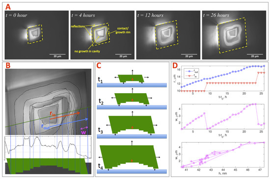 The plot of the inner, , and outer, , radius of the crystal as a function of time in Figure 2D (top) shows that the outer surfaces of the crystal grow at a constant rate ( nm/h), while the inner radius of the growth rim, (radius of cavity), moves stepwise. The rim width versus time shown in Figure 2D (middle) therefore repeatedly grows to a maximum of 4–5 m and suddenly jumps to a minimum of 1–2 m. The distance between the crystal growth rim and the glass, h, calculated using Equation (1) is found to increase linearly with rim width, w (Figure 2D, bottom) [24].
