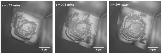 - Local poisoning of growth by “dirt”, asperities on the glass surface or organic molecules from the PDMS? We have no evidence that the solutions or the PDMS are different in the experiments of smooth vs. rough growth rims. Sometimes, we have observed smooth and rough growth rims on crystals adjacent to each other in the same experiment like Crystals E and F (see the images in the Supplementary Materials). If a surface active contamination adheres to the growing surface, it is likely to be incorporated in the crystal when it continues growing. Then, there would have to be a continuous addition of contamination for rough crystals to keep them rough and no contamination for smooth crystals. If the “contamination” adheres to the glass surface, it would be a constant source of “disturbance” at a fix point in space.