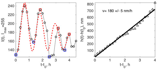 where m is an integer counting the number of periods and the phase shift corresponding to the distance . The right-hand panel of Figure 4 shows the change in height, , calculated using the intensity data shown in the left-hand panel. The least squares fit yields the vertical growth rate with the standard deviation. This value of v is used with a smooth amplitude function to produce the fit (red dashed line) to the original data in the left panel of Figure 4.