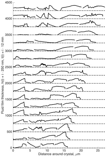 Profiles of the crystal: glass distance (fluid film thickness), h, around the rim of Crystal B at different times. Each new profile is shifted 250 nm up to separate them.