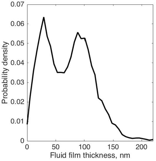 which has a maximum for nm. This is inside the first peak in the fluid film width distribution in Figure 8. This is a surprising result, because intuition tells us that the vertical growth should increase with fluid film thickness h because there is more room for diffusion of ions into the contact. The positive feedback yielding a maximum is due to the fact that the ions diffusing in a thinner film distribute over a narrower contact width.
