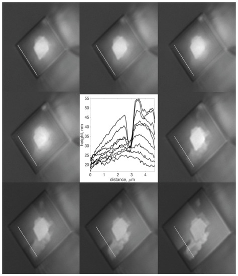 Evolution from smooth to rough growth rim for Crystal H at = 0.6. The images are m, and the time between images is 6 min. The figure shows height profiles along the white line in the images demonstrating how the initially smooth, flat surface develops a “protrusion” pushing the crystal up and tilting it.