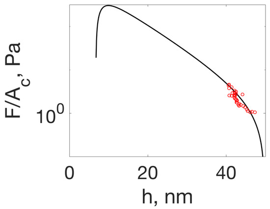For Crystal A, we calculated the stress at the contact . Using this calculation for the widths shown in Figure 2D and using Equation (1) and the corresponding intensities, we may calculate the disjoining pressure versus fluid film thickness, h. As mentioned, the absolute value of the calculated fluid film thickness has an uncertainty of about nm due to the uncertainty of determining the minimum intensity of the closest contact.