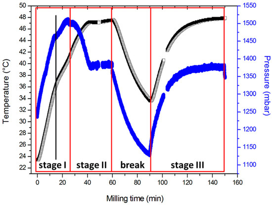 The mechanochemical synthesis of the quaternary sulfides is always challenging, and the possible interaction between elemental precursors can proceed in different manners, depending e.g., on the morphologies of used metals. A possible explosive reaction between Cu and S should have taken place, as the same elemental precursors as in paper [33] were used. However, in this case, the explosion documented by a sharp pressure increase could possibly not be evidenced, because there was quite a large number of other elements present. The kinetics of the synthesis of CFTS phase was already described in [31], where it was found out that the reaction proceeds through the formation of CuS, and then continues with consumption of tin, and iron is embedded into the structure as the last element. Based on this, possible reactions stages can be distinguished, although the milling was performed in different mill in that case. However, the results provided therein, in combination with pursuing of pressure and temperature in the milling chamber, can give us at least some idea about the processes taking place. The gas pressure and temperature changes with respect to milling time are presented in Figure 1.