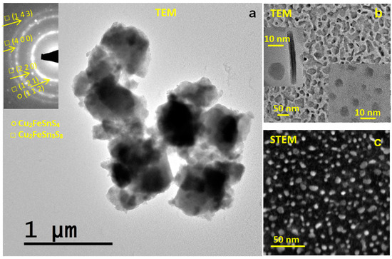 CFTS sample after milling is formed by agglomerated nanoparticles as it is shown in the TEM micrograph (Figure 3a). The corresponding characteristic ED inset is formed by rings due to the small coherent diffraction domains (10–20 nm). All of them were indexed in the tetragonal system of the Cu2FeSnS4 (1–42 m space group) and Cu2FeSn3S8 (141/a space group) compounds and the planes are marked. These data are in agreement with the X-ray diffraction results. Around the agglomerated particles, very small isolated nanoparticles were found, as it is shown in the TEM and STEM micrographs presented in Figure 3b,c. These nanoparticles show square-faceted shape with a bimodal character. Some nanocrystals are faceted and very small (5–10 nm) with square and elongated shape (insets of Figure 3b) and others form a kind of fractal structure.