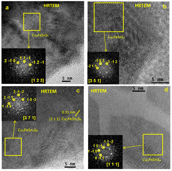The high resolution TEM images of the agglomerated areas show that the sample is formed by very small crystallites (Figure 4a–c). Some oriented crystallites (marked in yellow square) and the corresponding first Fourier transform (FFT) are depicted in the insets. The analysis of the reciprocal spacings in the FFT allows us to distinguish which is the crystalline phase and the (h k l) planes are marked. Cu2FeSnS4 and Cu2FeSn3S8 phases were found in the sample. Two Cu2FeSnS4 crystallites oriented along the [1 2 3] and [3 5 1] zone axes (Figure 4a,b, respectively) and Cu2FeSn3S8 oriented along the [3 7 1] direction (Figure 4c) are depicted for the sample.