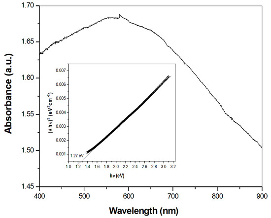 The optical properties of the synthesized CFTS nanocrystals were investigated using UV–Vis absorption spectroscopy. Figure 5 shows the obtained spectrum with a broad absorption in the visible range of wavelength. The optical band gap energy of the CFTS sample was determined by plotting (αhν)2 as a function of the photon energy (hν) and extrapolating the linear portion of the spectrum in the band edge region, as it is displayed in the inset of Figure 5. The band gap energy was calculated by a procedure described in paper [30]. The obtained value 1.27 eV is acceptable for absorbers in solar cells [34,35].