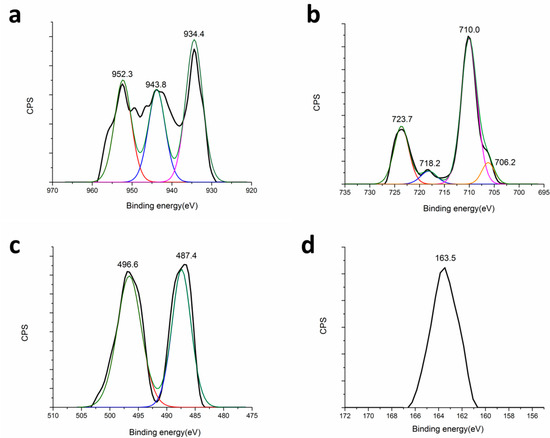 X-ray photoelectron spectroscopy was used to elucidate the surface composition of as-synthesized CFTS nanocrystals, as it is shown in Figure 6. Figure 6a shows that the most intensive Cu binding peaks were located at 934.4 eV and 952.3 eV. The peak splitting of 17.9 eV indicates Cu(I) configuration [38,39]. However, the satellite peak at 943.8 eV documents also the presence of a small amount of copper in Cu(II) configuration. The most prevailing peaks at 710.0 eV and 723.7 eV (Figure 6b) can be assigned to Fe(II) configuration, which corresponds to reported values in literature for CFTS phase [38,40,41]. XPS spectrum of tin in Figure 6c with peaks at 487.4 eV and 496.6 eV documents the presence of Sn(IV) configuration [38,39]. Finally, in Figure 6d, high-resolution spectrum for sulfur is given. The solo peak at 163.5 eV is the evidence of S(-II) configuration [39] and it is in accord with the 160–164 eV range expected for S in sulfide phases [38]. The values of binding energies indicate that the four elements are in Cu(I), Fe(II), Sn(IV) and S(-II) oxidation states, which was also documented in other works where non-mechanochemical approach for synthesis of CFTS has been applied [34,35,37,42,43,44].