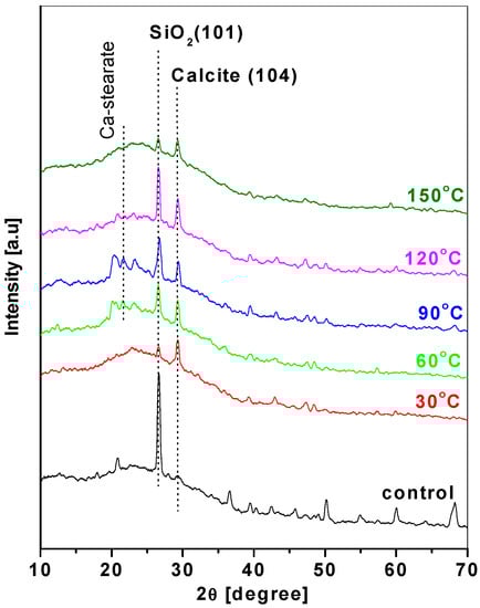 Figure 1 shows the XRD spectrum of the control and the carbonated cement cubes at different temperatures. The major peak of the controlled experiment were comprised of crystalline SiO2 diffraction signal value at 2θ = 26.66°. It is well known that SiO2 is the common major constituent of the sand. On the other hand, XRD of the carbonated samples showed formation of a new peak at 2θ = 29.32°, which corresponds to that of calcite peak (CaCO3). Among the polymorphs of CaCO3 (calcite, aragonite, and vaterite), calcite is the thermodynamically stable phase under ambient conditions. This clearly indicates that carbonation has taken place in the materials undertaken for this study. Solid state 13C CP-MAS NMR also corroborates this and is discussed in the later section. Besides the peaks of SiO2 and CaCO3, few peaks at higher carbonation temperatures (60 and 90 °C) arise, which may be attributed to the association of organic molecule with the cement matrix to form calcium stearate. Ozturk et al. have reported the synthesis and X-ray diffraction of calcium stearate [27]. As per the synthesis procedure we synthesized 50% excess calcium stearate precipitate and obtained XRD spectrum which showed a high intensity diffraction peak at 2θ value of 19.96°. We assume small peaks near 20° to be associated with calcium stearate in the cement matrix. Several typical vibrations bands of pure stearate molecules, including 2920, 2848 and 1463 cm−1 in the FTIR spectrum of stearate with different temperatures, are also observed (Figure S1).