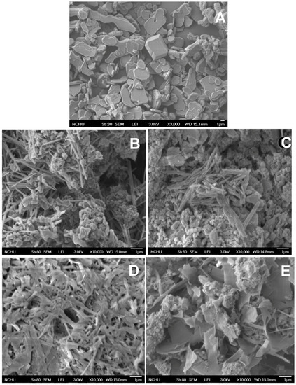 SEM images of the carbonated samples (A) 30 °C, (B) 60 °C, (C) 90 °C, (D) 120 °C, (E) 150 °C.