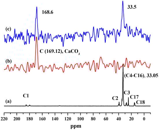 Solid-state 13C CP-MAS NMR (a) calcium stearate (b) carbonation of cement without stearate (c) carbonation in the presence of stearate.